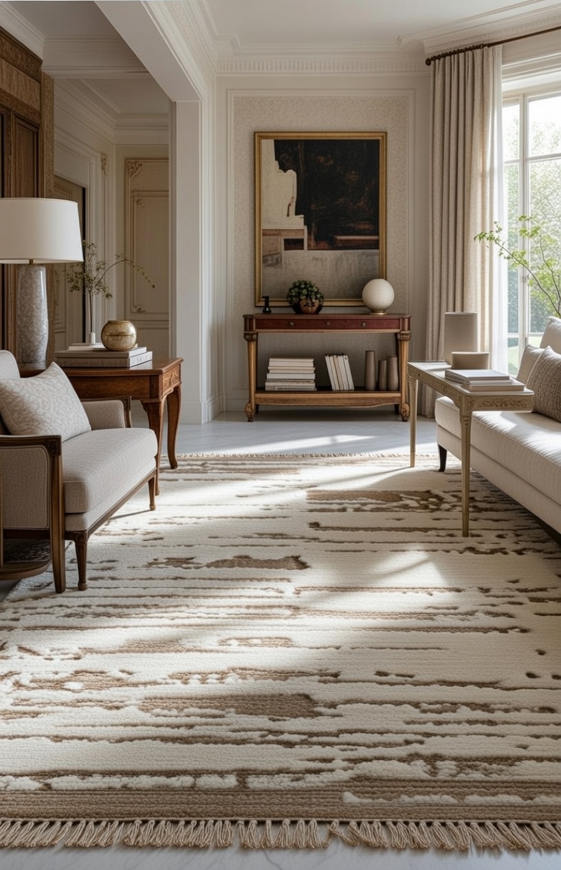 Silk highlights subtly respond to ambient light while dense wool yarns ensure durability—making this rug a perfect foundation for elegant and contemporary interiors.