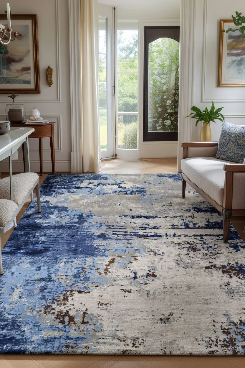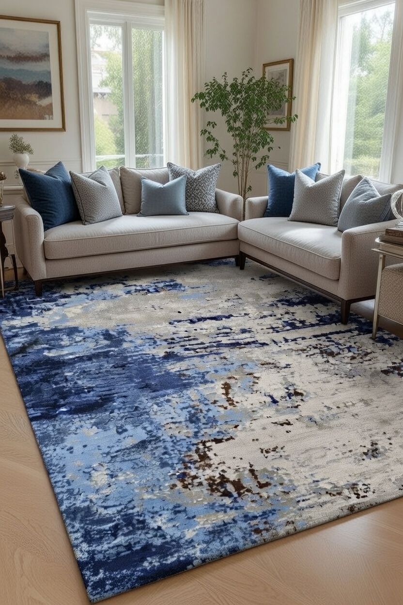 Subtle silk highlights respond beautifully to ambient light, while layered blue and multi-tonal accents