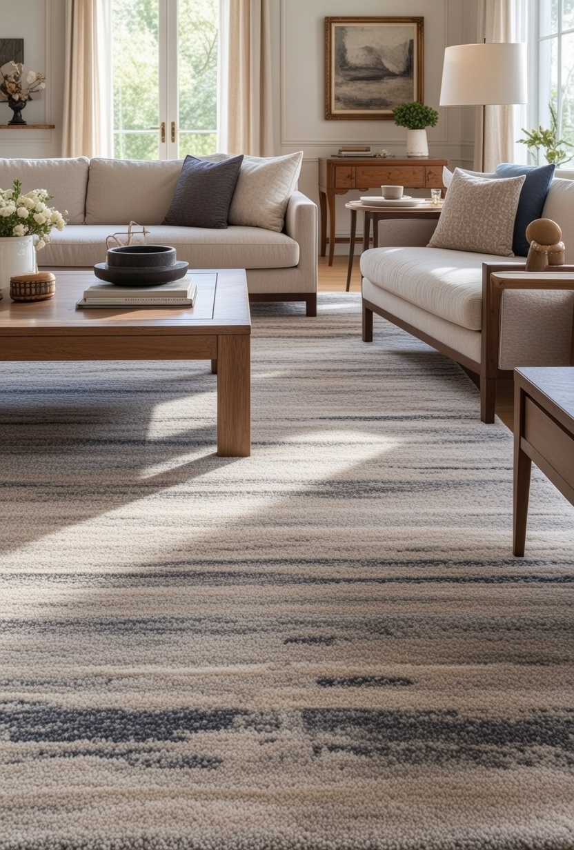 Silk highlights subtly interact with light while dense wool yarns ensure long-lasting durability—making this rug a sophisticated choice for luxury living spaces.