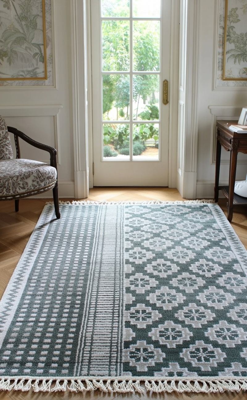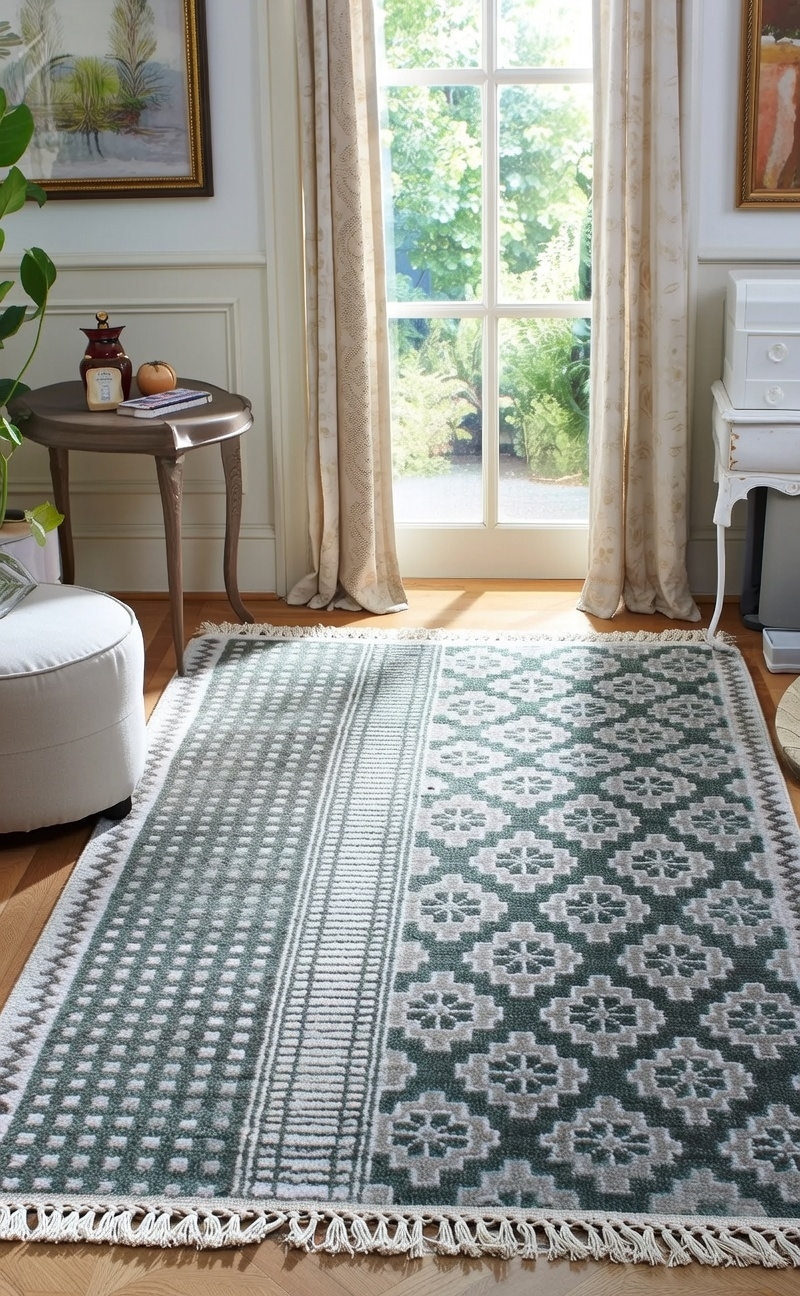 Soft sea-green tones layered with subtle silk highlights respond gracefully to light, while dense wool yarns ensure durability—making this rug an elegant choice for serene, contemporary living spaces.