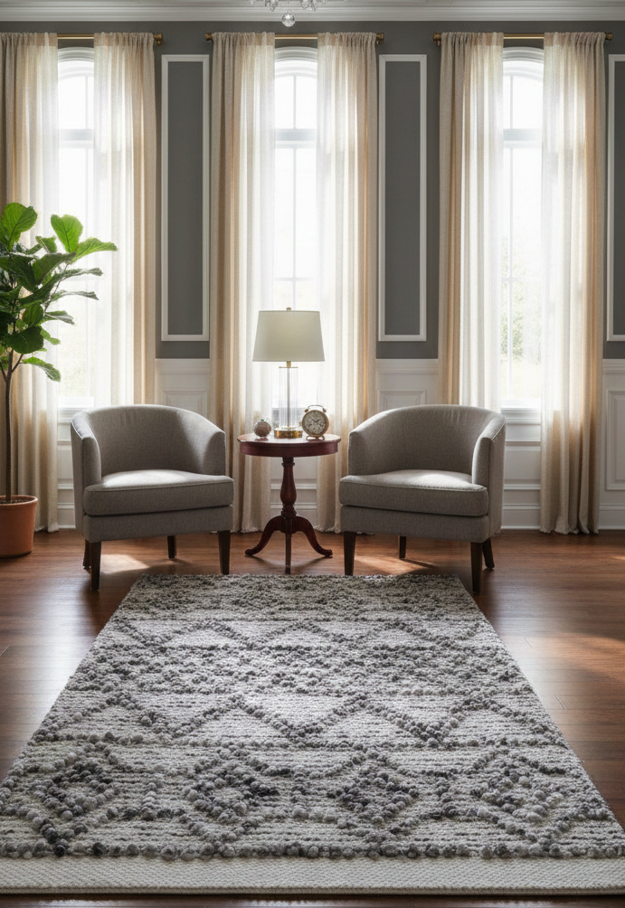 The Abacus Grey Multi Rug is crafted using recycled plastic bottles, combining sustainability with modern style.