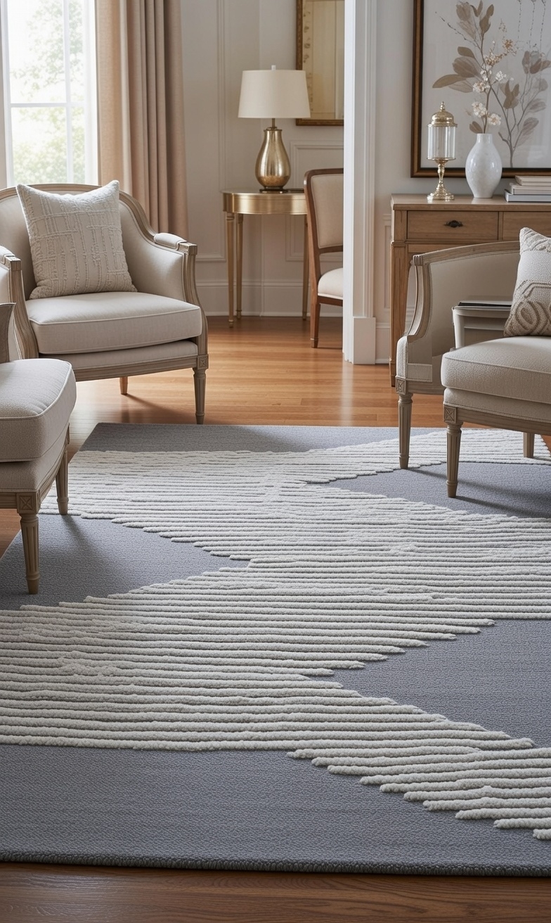 The Arizona Ivory Ice Flow Rug is crafted from recycled polyester fibers for superior indoor and outdoor durability.