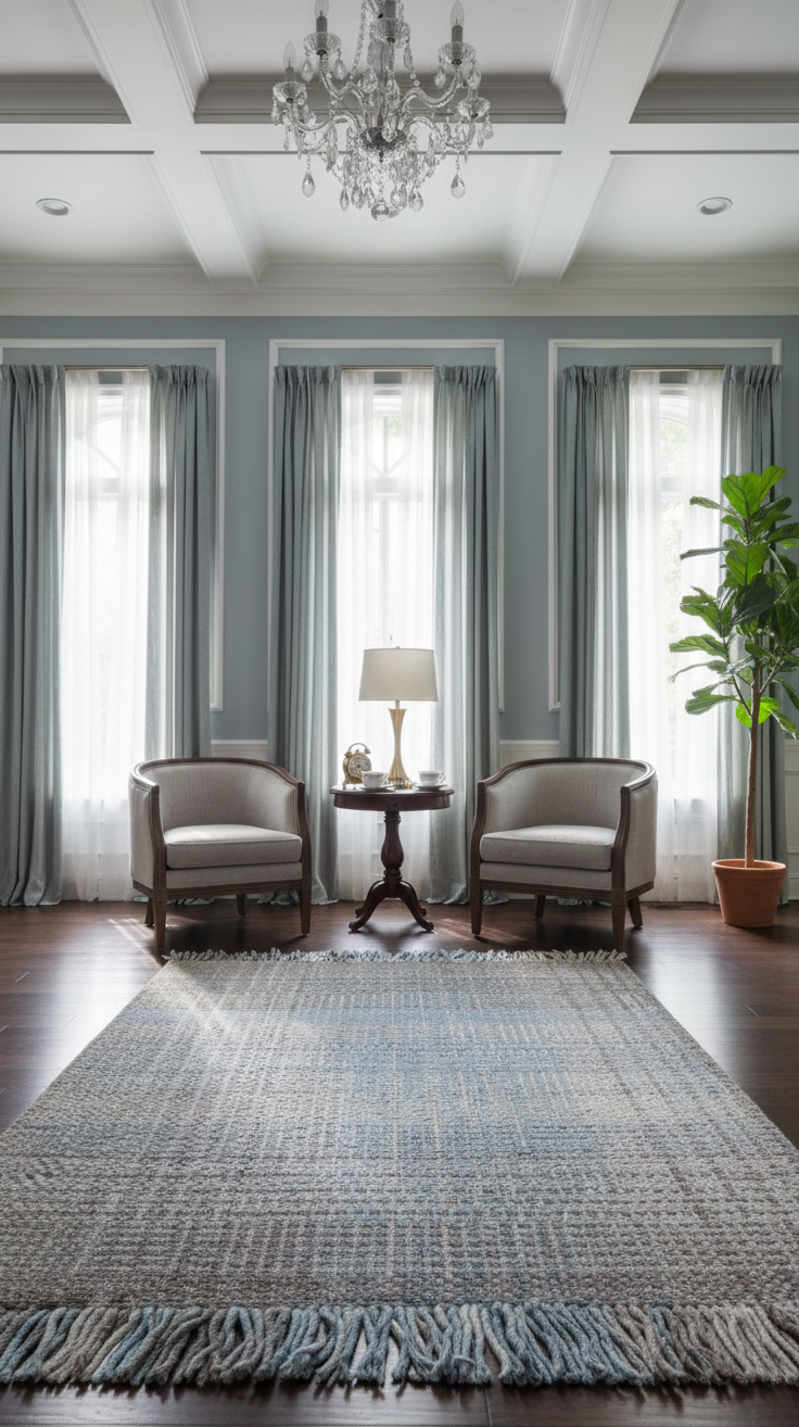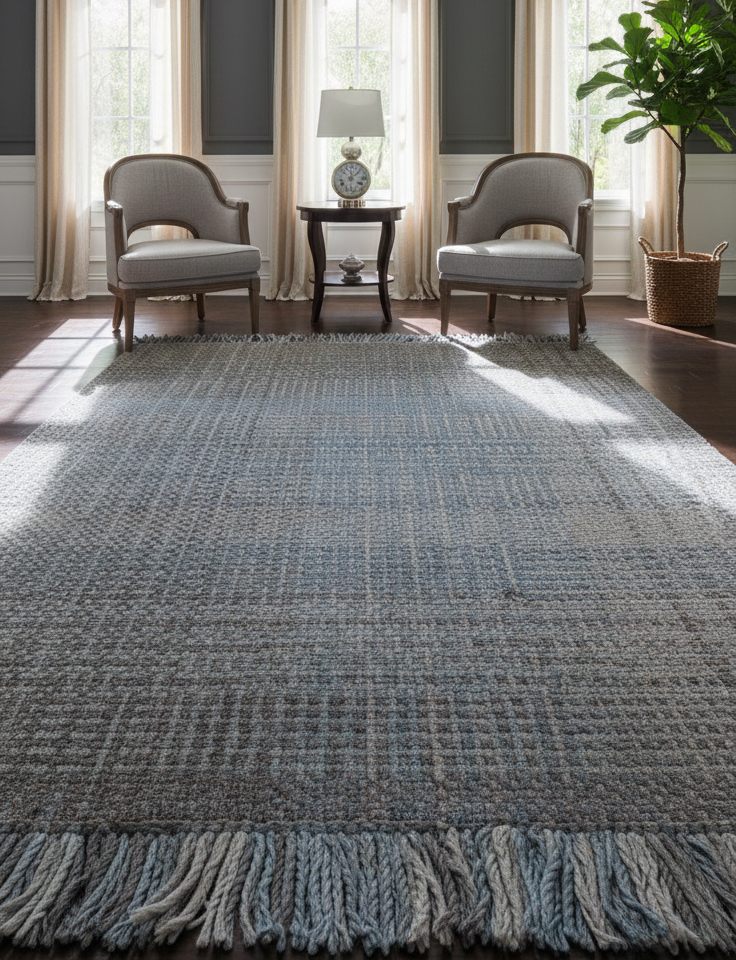 The Retro Blue Mist Rug is crafted from recycled polyester fibers, offering durability with soft modern aesthetics.