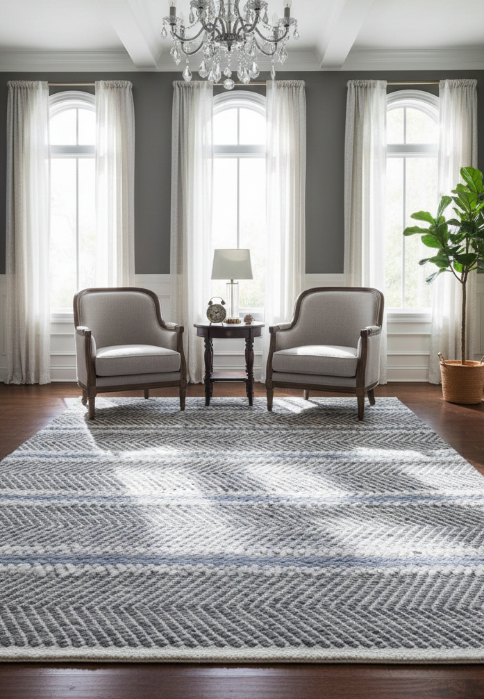 The Patio Grey Multi Rug is crafted from recycled polyester fibers, offering superior durability and contemporary design.