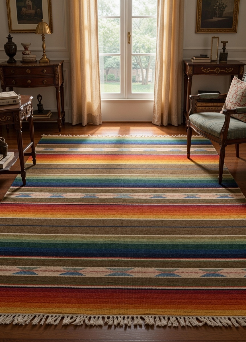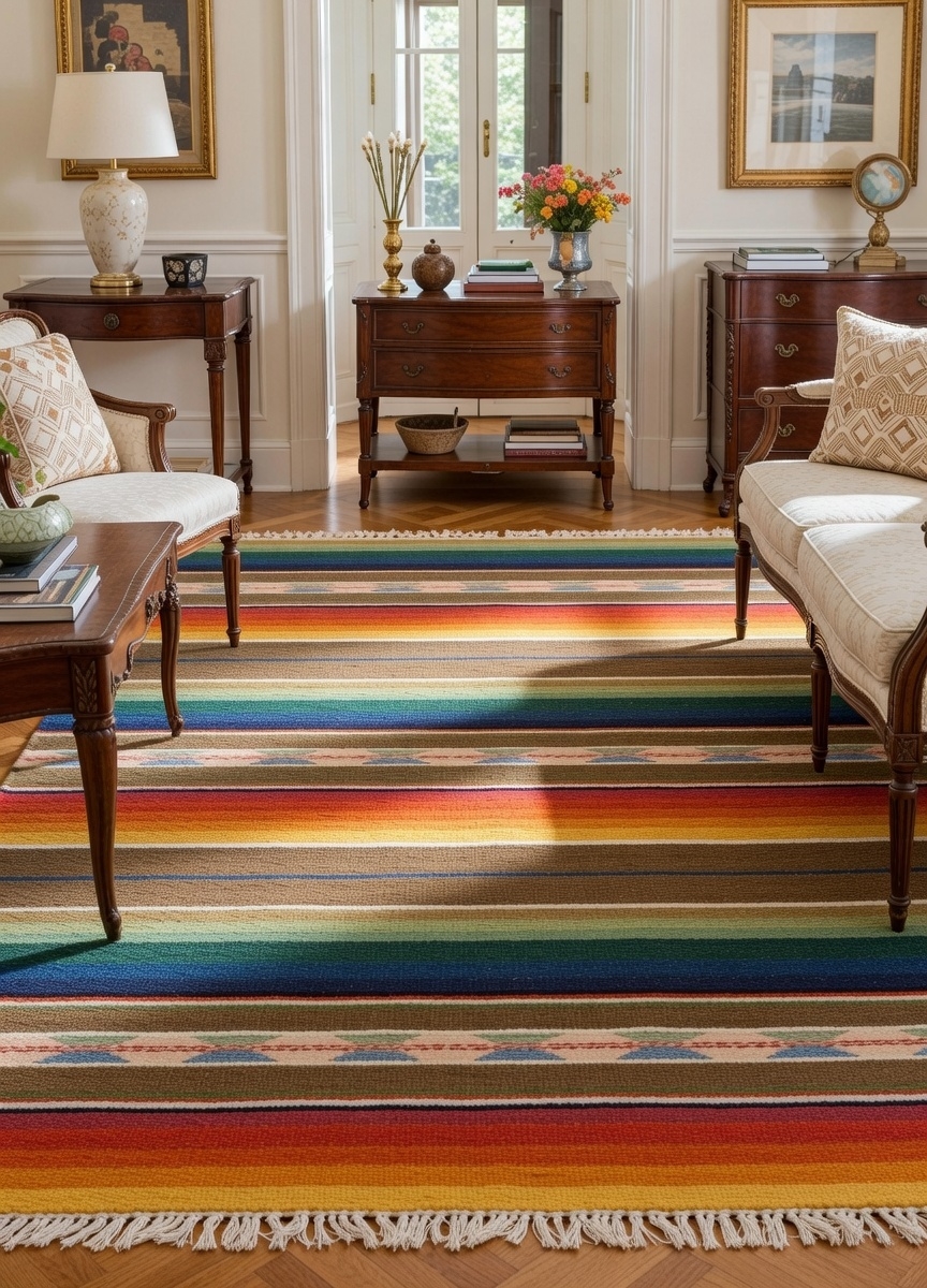 Ruler Stripe Colorful Rug showcases vibrant stripes with traditional flat weave craftsmanship.